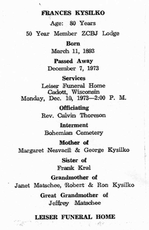 Frances Kysilko Funeral services were held Monday, Dec. 10 at 2 p.m. at the Leiser Funeral Home for Mrs. Frances Kysilko, 80 year old resident of Route 1, Cornell. Mrs. Kysilko was born Frances Kral on March 1, 1893 at Zbiroh, Czechoslovakia, daughter of Peter and Josephine Matousek Kral. She came to this country with her parents in 1906 and settled in Austin, Minn. On November 26, 1912, she was married to Joseph Kysilko at Albert Lea, Minn., and came to the Colburn Community where they farmed all their lives and where she still resided on the home farm before being hospitalized. She passed away Friday, December 7th at 12:30 p.m. at the Golden Age Home. Her husband preceded her in death on March 23, 1950. She was a member of ZCBJ Lodge and a 50-year honored member. Survivors include one daughter, Mrs. John (Margaret) Nesvacil, Cadott; one son, George Kysilko, Route 1, Cornell; a brother, Frank Kral, Boyd; three grandchildren, Janet Matschee, Lacrosse, Robert and Ron Kysilko, Route 1, Cornell; and one great-grandson, Jeffery Matschee and a number of nieces and nephews. She was preceded in death by her parents, a brother and a sister. Rev. Calvin Thoreson officiated at the funeral. Mrs. Ray Post was the soloist, accompanied by Carmen Filtz. Pallbearers were Kenneth and Clarence Nelson, Lief Weeks, William Burich, Donald Naiberg and Paul Kral. Interment was in the ZCBJ Cemetery. |